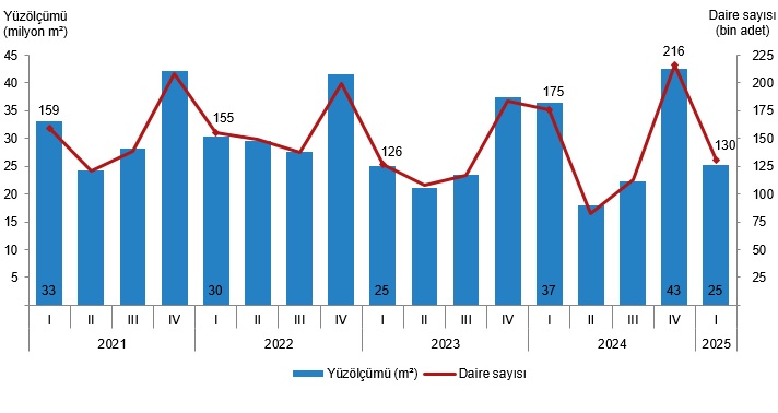 2025 yılının ilk üç ayında belediyeler tarafından yapı ruhsatı verilen bina sayısı bir önceki yılın aynı dönemine göre %21,3 azalarak, daire sayısı %18,7, toplam yüzölçümü ise %24,7 geriledi. Bu dönemde toplam yapı ruhsatı verilen binaların yüzölçümü 27 milyon metrekare olarak gerçekleşti.