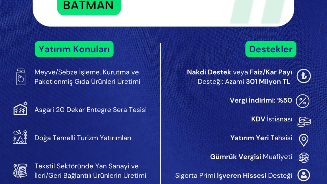 Detaylı bilgi almak isteyenler, Dicle Kalkınma Ajansı Batman Yatırım Destek Ofisi'ne başvurabilecek. Program ile il genelinde üretim ve istihdama yönelik yatırımların artırılması hedefleniyor.