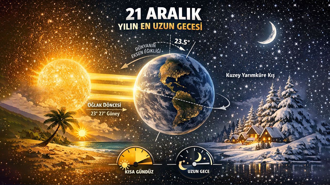 Dünya, Güneş’in etrafında dönerken ekseni yaklaşık 23,5 derece eğik bir şekilde konumlanmıştır. Bu eğiklik, yıl boyunca Güneş ışınlarının Dünya yüzeyine farklı açılarla düşmesine yol açar. Sonuç olarak mevsimler oluşur ve gündüz–gece süreleri yıl içinde değişkenlik gösterir. 21 Aralık, bu döngünün en belirgin kırılma noktalarından biridir.