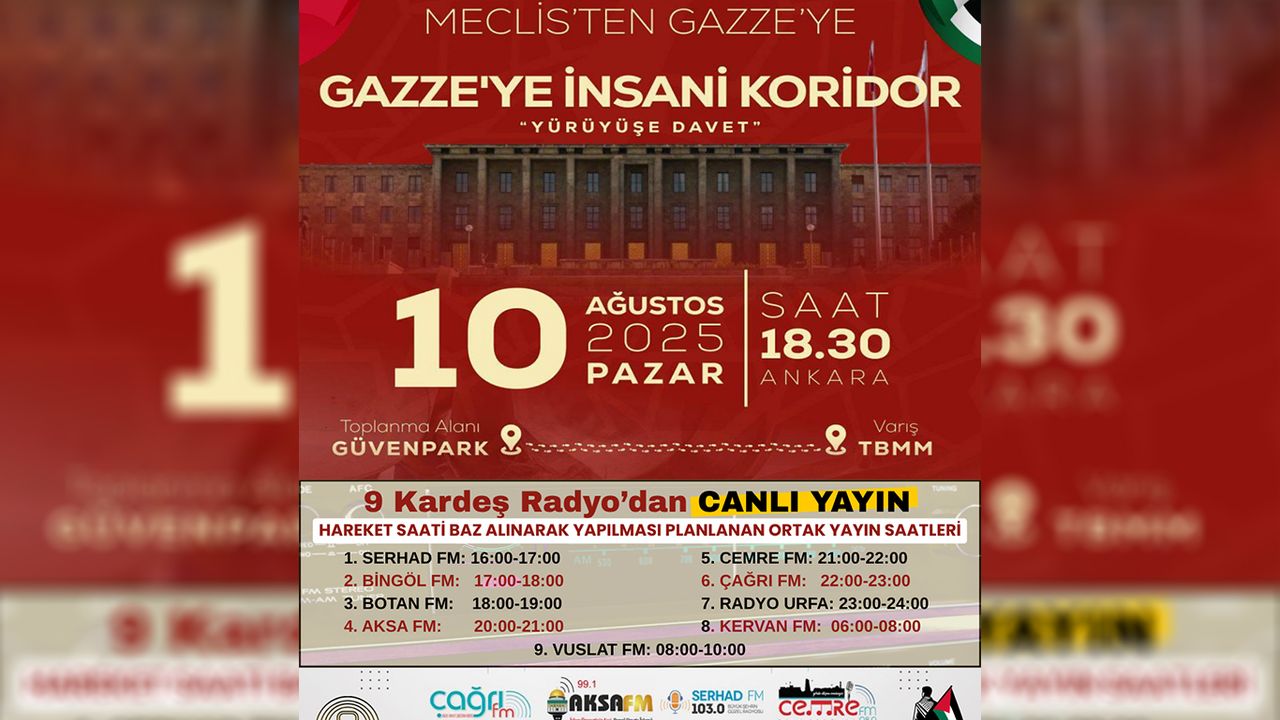 Şanlıurfa’da yayın yapan Radyo Urfa, 10 Ağustos’ta Ankara’da gerçekleştirilecek "Anadolu’dan Meclis’e, Meclis’ten Gazze’ye İnsani Koridor" yürüyüşüne destek amacıyla canlı yayın yapacak.