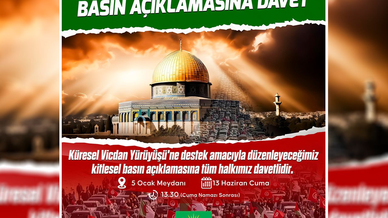 5 Ocak Meydanı’nda yapılacak basın açıklaması, Cuma namazının ardından saat 13.30’da başlayacak. Basın açıklamasında, işgal rejiminin saldırılarına dikkat çekilecek ve Kudüs’e yönelik duyarlılığın artırılması hedeflenecek.