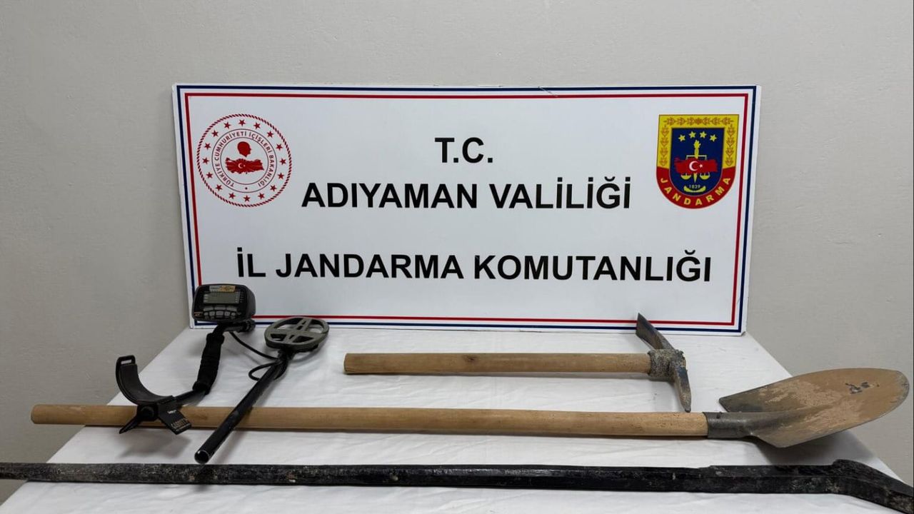 Kazı alanında dedektör, kazma, kürek ve demir aparat ele geçirildi.