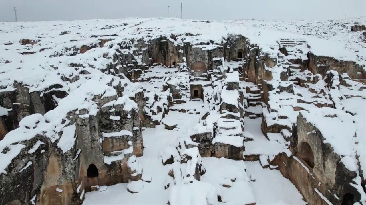 Tarihi dokusu ve doğal yapısıyla kentin önemli kültürel mirasları arasında yer alan antik kent, karla birlikte eşsiz bir manzaraya sahne oldu.