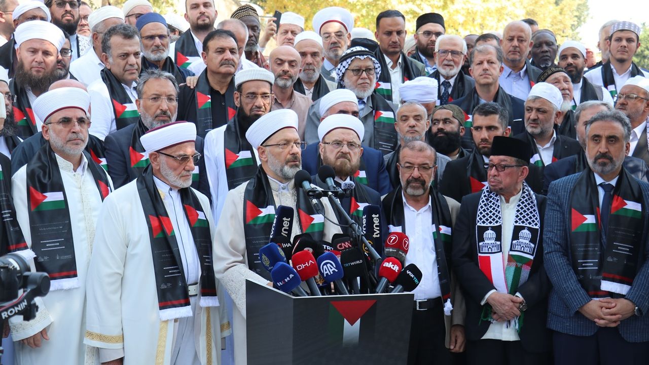 Basın açıklaması öncesinde bir konuşma yapan Diyanet İşleri Başkanı Prof. Dr. Ali Erbaş, "Tüm dünyanın gözü önünde Filistin'de bir millet yok ediliyor. Bütün tarih, kültür, medeniyet, vicdan, ahlak yok ediliyor. Tüm insanlığın haremi ismeti, ortak değerleri, onuru ve haysiyeti yok ediliyor. Bir terör şebekesi, bir haydut sürüsü, azgın ve sapkın bir çete, dünyanın gözü önünde vahşet üzerine vahşet uyguluyor. Bir enkaza çevirdiği Gazze'yi şimdi de tamamen işgal etmek üzere harekete geçiyor. Bu vahşeti durdurmak zorundayız. Zira Filistin davası, bir iman, ahlak ve vicdan meselesidir. Filistin'e huzur gelmeden yeryüzüne huzur gelmeyecektir. Filistin'i bir kene gibi yapışmış olan zalimlerden kurtarmak zorundayız. Bunun için tüm Müslümanlar, Müslüman devletler, tüm vicdan sahipleri bir araya gelerek zalimleri durduracak ciddi kararlar almak, yaptırımlar uygulamak zorundayız." dedi.