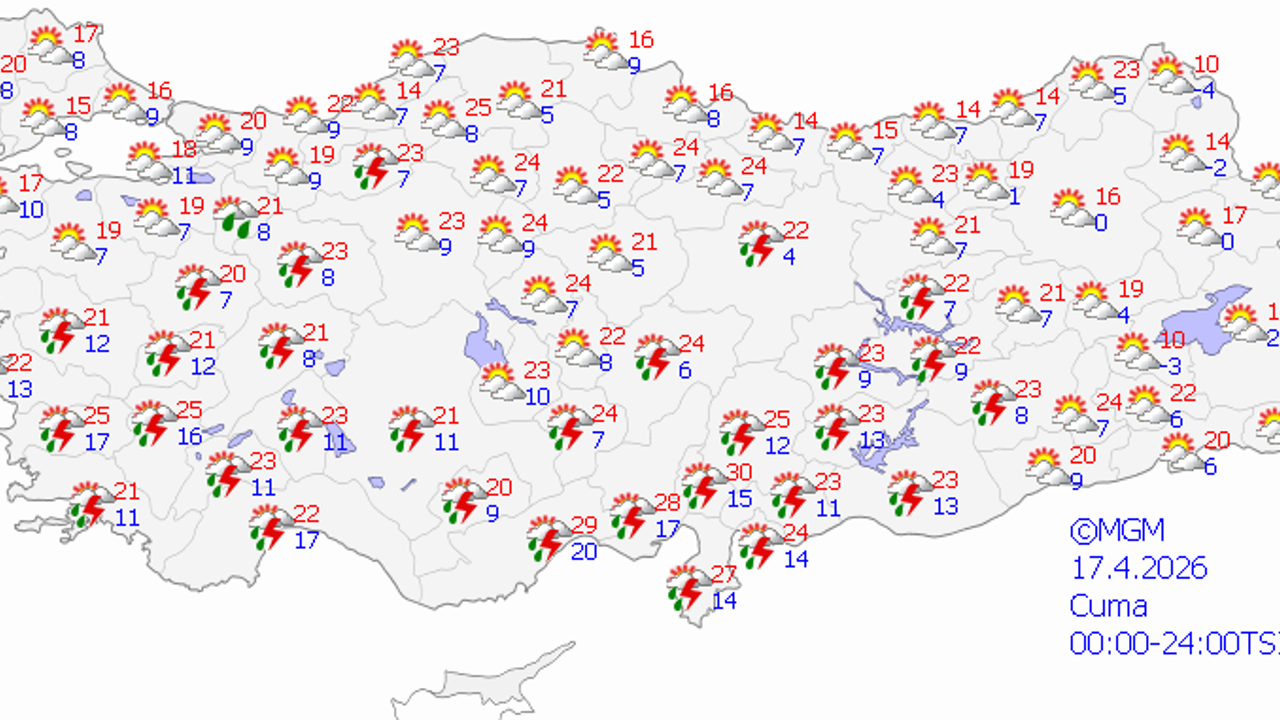 Yarın sabah saatlerinde sağanak yağış bekleniyor ve sıcaklık 11°C olacak. Gün ortasında gök gürültülü sağanaklarla birlikte 13°C, akşam saatlerinde bulutlu 11°C, gece ise sağanak yağışlı 7°C olacak.