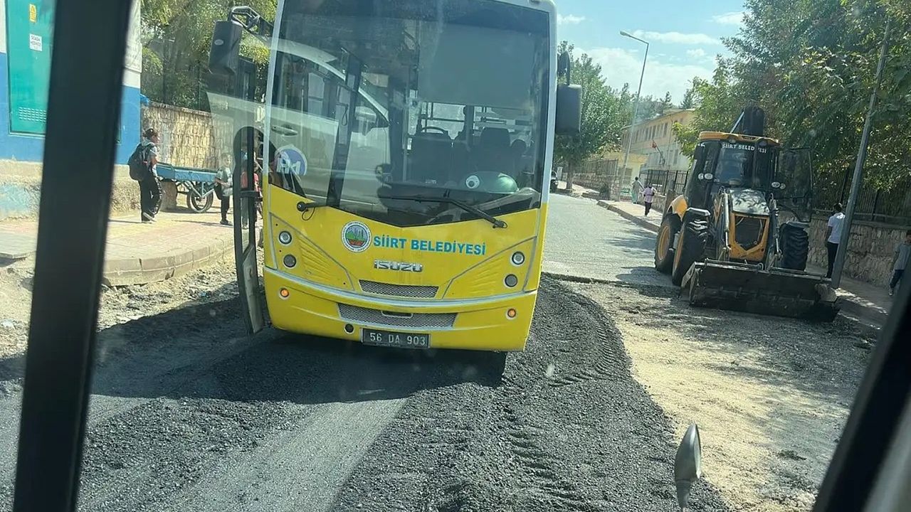 Edinilen bilgilere göre, yol bakım ve onarım çalışmaları kapsamında dökülen asfaltın üzerinden geçen otobüs, zeminin çökmesi sonucu tekerlekleriyle asfalta gömüldü.