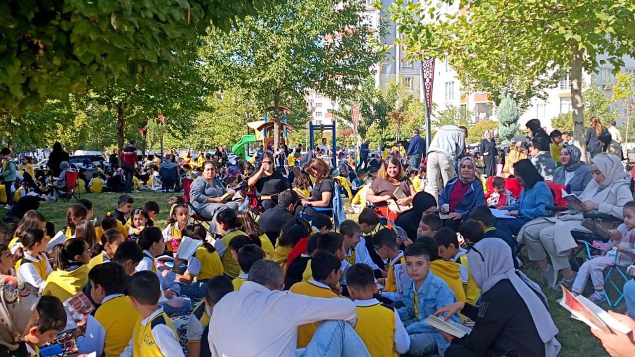 Okulun önündeki parkta düzenlenen etkinlikte öğrenciler, veliler, öğretmenler, okul çalışanları ve servis şoförleri bir araya gelerek aynı anda kitap okudular.