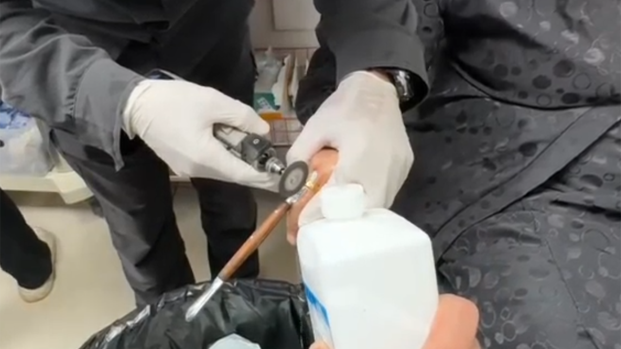Durumun bildirilmesi üzerine hastaneye gelen itfaiye ekipleri, dikkatli çalışma sonucu parmağa sıkışan yüzüğü keserek çıkardı.
