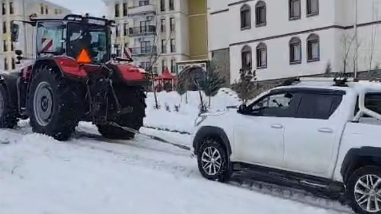 Ciğerlo TOKİ bölgesinde kar nedeniyle kayganlaşan yollarda ilerleyemeyen bir araç mahsur kaldı. Sürücünün zor anlar yaşadığı bölgede, araç traktör yardımıyla bulunduğu yerden çekilerek kurtarıldı.
