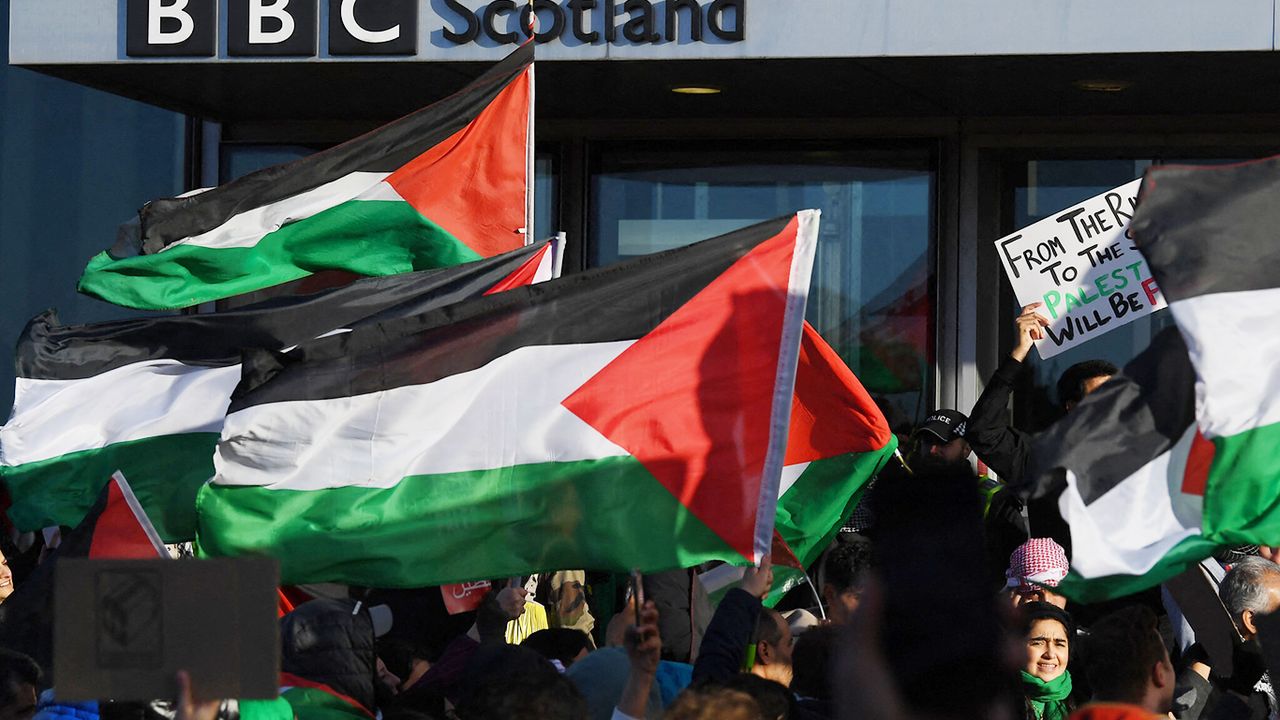 Ellerinde Filistin bayrakları taşıyan ve "Özgür Filistin" sloganları atan göstericiler, BBC'nin yayınlarında Gazze'deki gerçekleri yansıtmadığını ve halkı yanıltmak amacıyla kasıtlı bir şekilde manipülasyon yaptığını belirtti.