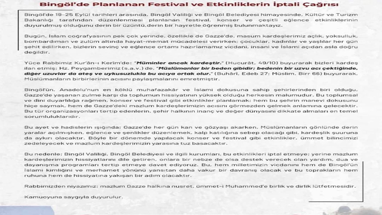 “Bingöl’de 19-25 Eylül tarihleri arasında, Bingöl Valiliği ve Bingöl Belediyesi himayesinde, Kültür ve Turizm Bakanlığı tarafından düzenlenmesi planlanan festival, konser ve çeşitli eğlence etkinliklerinin duyurulmuş olduğunu derin bir üzüntü, derin bir hayretle öğrenmiş bulunmaktayız. Bugün, İslam coğrafyasının pek çok yerinde, özellikle de Gazze’de, masum kardeşlerimiz açlık, yoksulluk, bombardıman ve zulüm altında hayat-memat mücadelesi verirken; çocuklar, kadınlar ve yaşlılar her gün şehit edilirken, bizlerin sevinç ve eğlence ortamı hazırlamamız vicdani, insani ve İslami açıdan asla doğru değildir. Yüce Rabbimiz Kur’ân-ı Kerim’de: “Müminler ancak kardeştir.” (Hucurât, 49/10) buyurarak bizleri kardeş ilan etmiş; Hz. Peygamberimiz (Sallallahu Aleyhi Vesellem) de: “Müslümanlar bir beden gibidir; bedenin bir uzvu acı çektiğinde, diğer uzuvlar da ateş ve uykusuzlukla bu acıya ortak olur.” (Buhâri, Edeb 27; Müslim, Birr 66) buyurarak Müslümanların birbirlerinin acısını paylaşmalarını emretmiştir. Bingöl’ün, Anadolu’nun en köklü muhafazakâr ve İslami dokusuna sahip şehirlerinden biri olduğu, Gazze’de yaşanan zulme karşı da toplumun hissiyatının yüksek olduğu herkesin malumudur. Bu toplumsal ve dini duyarlılığa rağmen, konser ve festival gibi etkinlikler planlamak; hem bu şehrin manevi dokusunu hiçe saymak, hem de Gazze’deki mazlum kardeşlerimizin acısını görmezden gelmek anlamına gelecektir. Bu tür organizasyonları tertip edenlerin, şehir halkının inanç ve değer dünyasını dikkate almaları en temel sorumluluklarıdır. Bu ayet ve hadislerin ışığında; Gazze’de her gün kan ve gözyaşı akarken, Müslümanların gönlünde derin yaralar açılmışken, eğlence ve şenlikler düzenlemek, alınganlığa sebep olacağı gibi, kardeşlik şuuruna da aykırı olacaktır. Böyle bir dönemde yapılacak konser ve festival gibi etkinlikler, ümmet bilincimizi zedeleyecek ve mazlum kardeşlerimizin yarasına tuz basacaktır. Bundan dolayı; Bingöl Valiliği, Bingöl Belediyesi ve ilgili kurumları, bu etkinlikleri iptal etmeye; yerine mazlum kardeşlerimizin hissiyatlarını dile getiren, onlara bir nebze de olsa destek verecek olan yardım, dua ve dayanışma programları tertip etmeye davet ediyoruz. Bu, hem milletimizin vicdanını hem de Bingöl’ün İslami kimliğini ve merhamet yönünü yansıtan daha vakur bir davranış olacak ve bu toprakların hem ruhuna hem de hissiyatına yakışan bir adım olacaktır. Rabbimizden niyazımız; mazlum Gazze halkına nusret, ümmet-i Muhammed’e birlik ve dirlik lütfetmesidir. Kamuoyuna saygıyla duyurulur.”