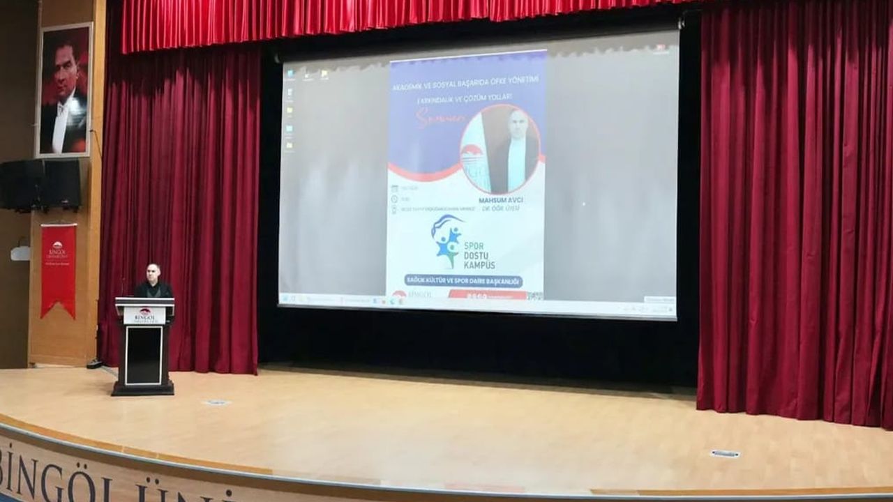 Bingöl Üniversitesi'nde, akademik ve sosyal başarıyı desteklemek amacıyla Dr. Öğr. Üyesi Mahsum Avcı tarafından "Akademik ve Sosyal Başarıda Öfke Yönetimi: Farkındalık ve Çözüm Yolları" konulu bir seminer gerçekleştirildi.