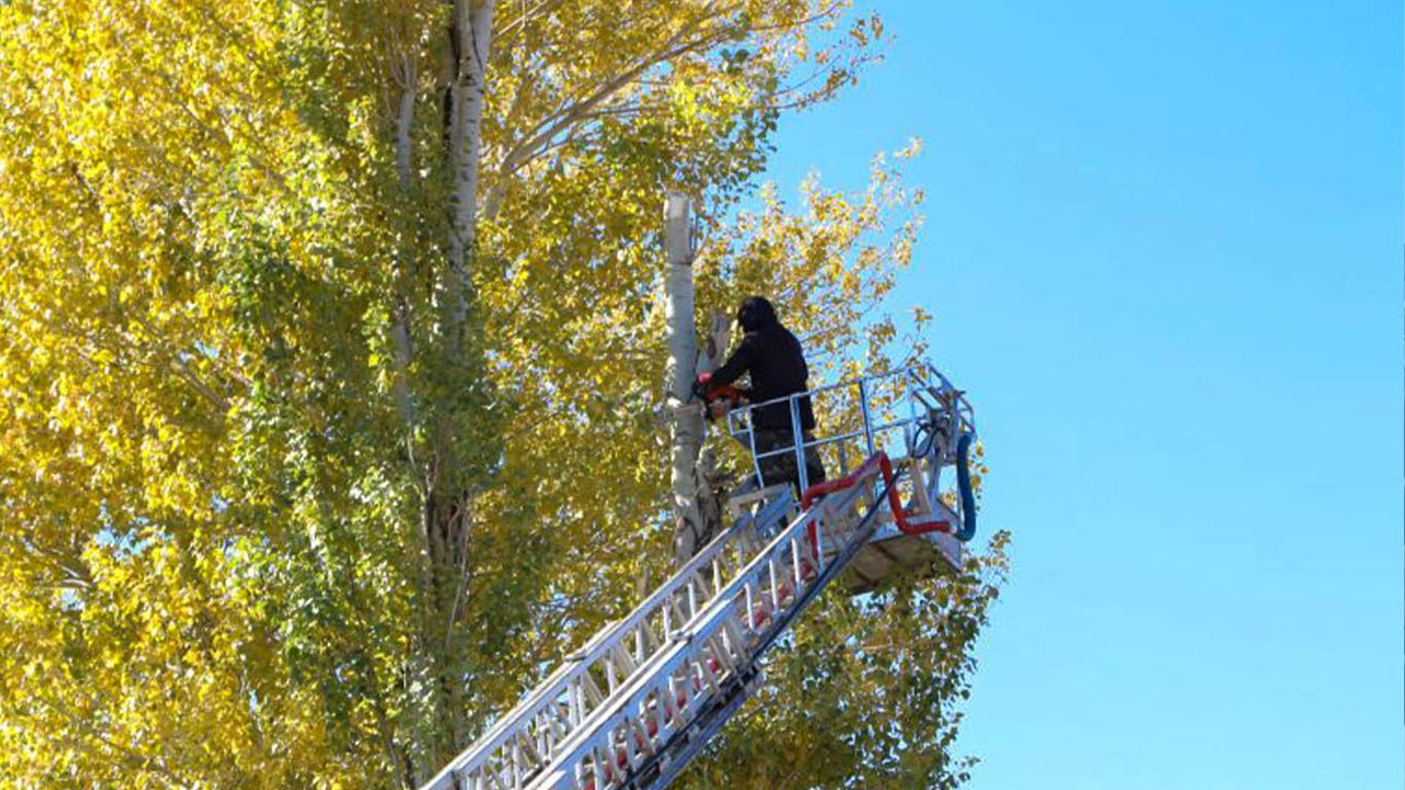 Kesilen ağaçların çevreye zarar vermemesi için gerekli güvenlik önlemleri alındıktan sonra, itfaiye merdivenine çıkan vatandaşlar ağaç kesme işlemini güvenli bir şekilde gerçekleştiriyor.