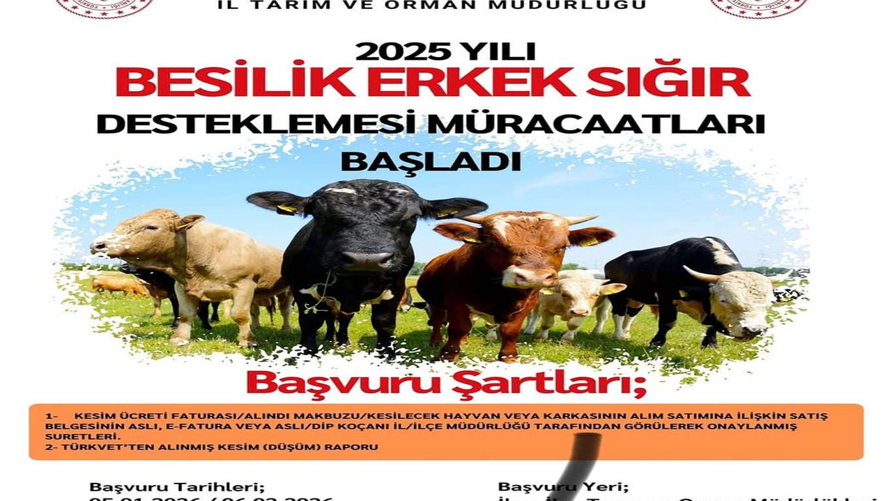 “2025 yılı besilik erkek sığır (Karkas) Destekleme müracaatları başlamıştır. Desteklemeden faydalanmak isteyen yetiştiricilerimizin başvurularını 05 Ocak 2026 – 06 Şubat 2026 tarihleri arasında il/ilçe tarım ve orman müdürlüklerine yapmaları gerekmektedir. Destekleme Kapsamı 1 Ocak – 31 Aralık 2025 tarihleri arasında, Bakanlıkça izin verilen mezbahanelerde kestirilen, 200 kilogram ve üzeri karkas ağırlığına sahip besilik erkek sığırlar destekleme kapsamındadır. Başvuru için gerekli belgeler: Kesim ücreti faturası / alındı makbuzu veya kesilecek hayvan ya da karkasın alım-satımına ilişkin satış belgesinin aslı, e-fatura çıktısı ya da aslı/dip koçanıil/ilçe tarım ve orman müdürlüğü tarafından görülerek onaylanmış suretleri, TÜRKVET sistemi üzerinden alınmış kesim (düşüm) raporu. Belirtilen şartları taşıyan ve belgelerini eksiksiz olarak teslim eden yetiştiriciler destekleme müracaatında bulunabilecektir.”