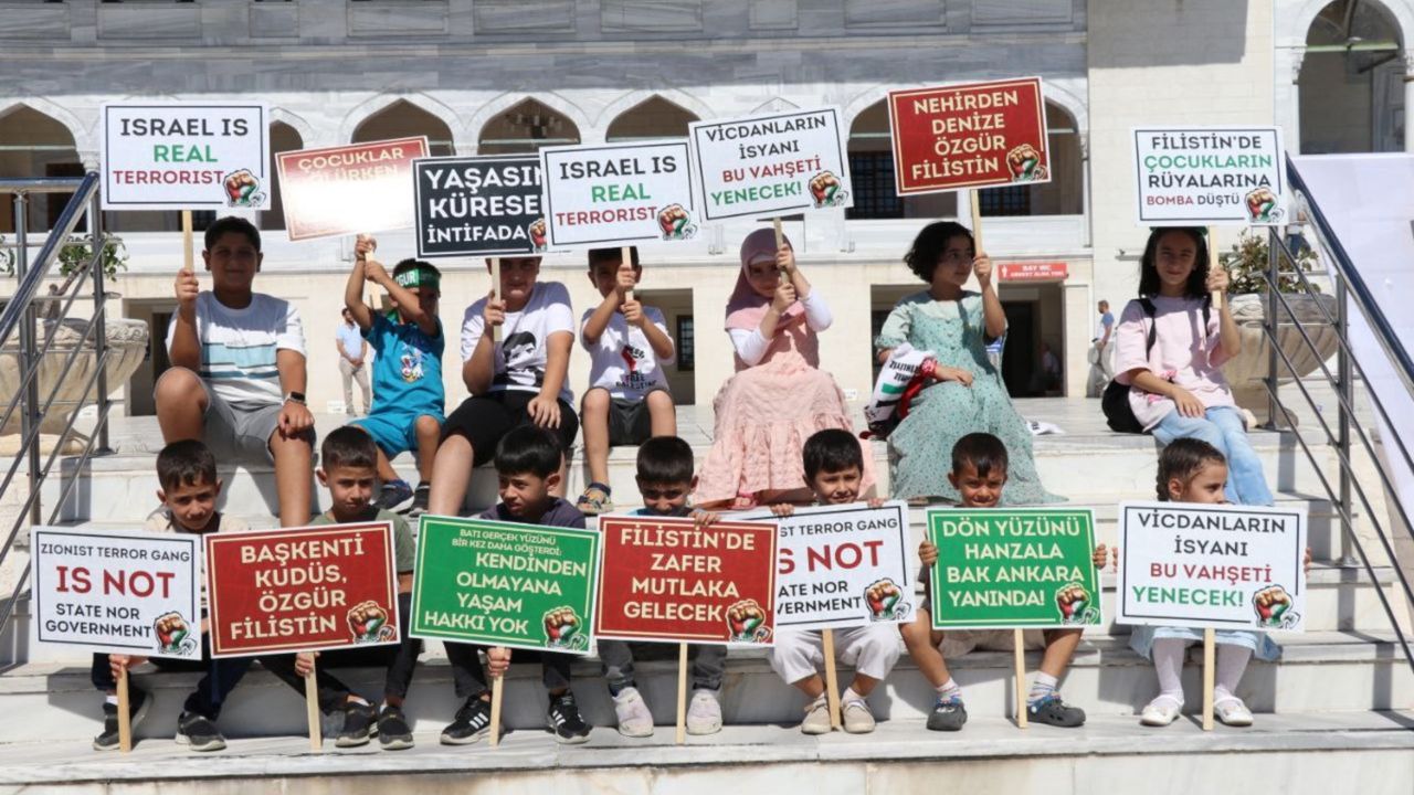 Kocatepe Camii'nde başlayacak yürüyüş için kalabalıklar toplanmaya başlarken, çocukların açtıkları pankartlar dikkat çekti.