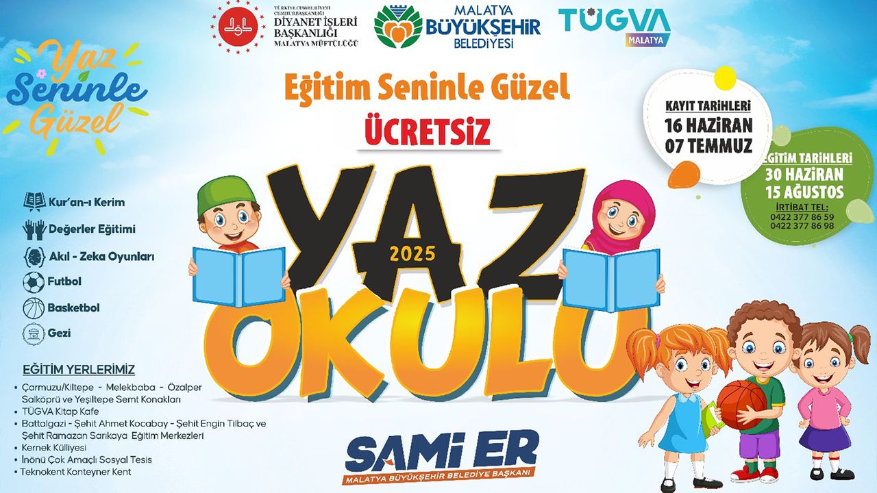 Malatya Büyükşehir Belediyesi Gençlik ve Spor Hizmetleri Dairesi Başkanlığı'na bağlı semt konaklarında "Yaz Seninle Güzel" sloganıyla 16 Haziran tarihinde başlayan ve 7 Temmuz tarihine kadar kayıtların devam edeceği Yaz Okulu, 30 Haziran-15 Ağustos tarihleri arasında gerçekleştirilecek.