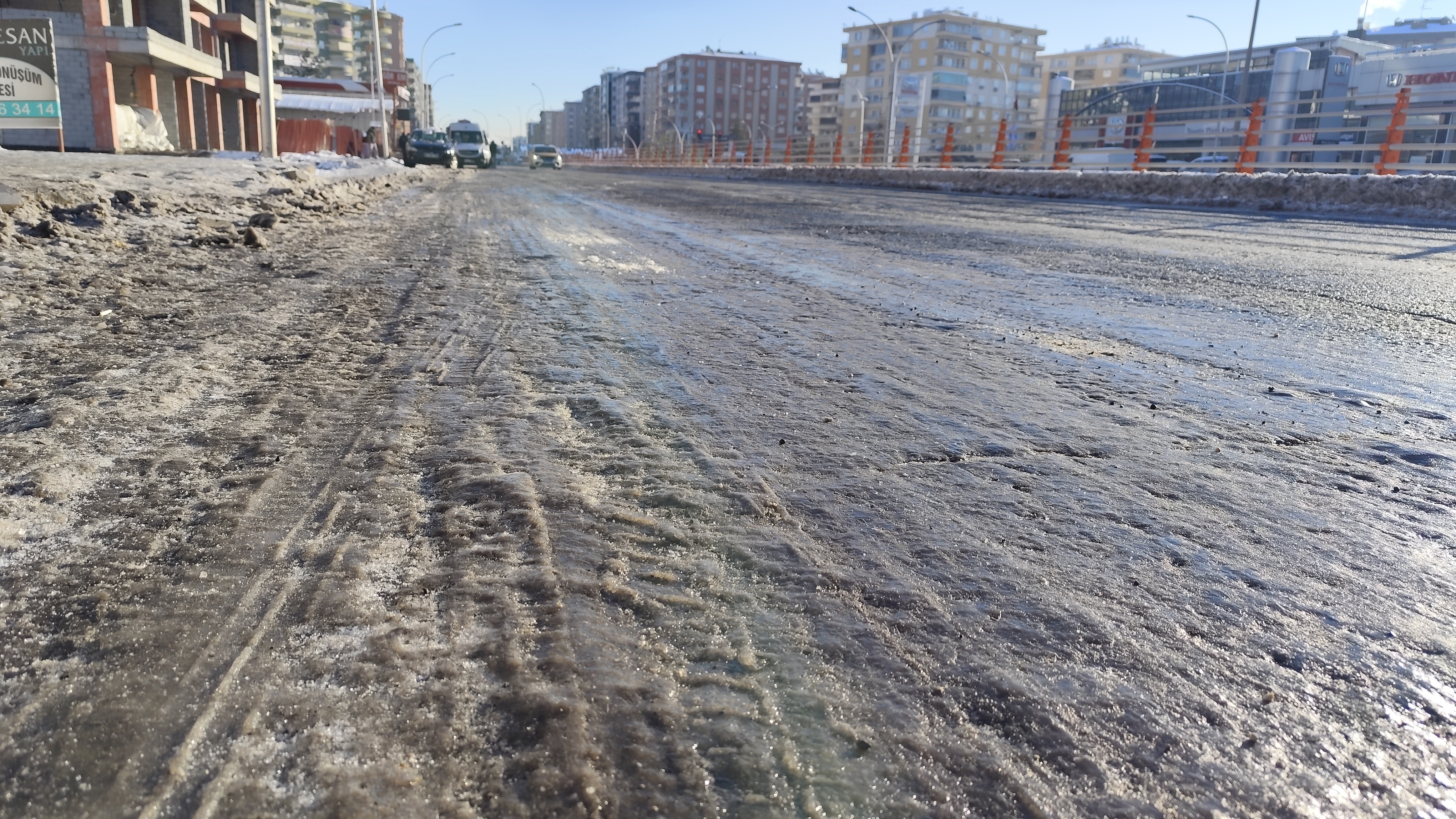 Soğuk havayla birlikte kent genelinde yol ve kaldırımlar buz tuttu.