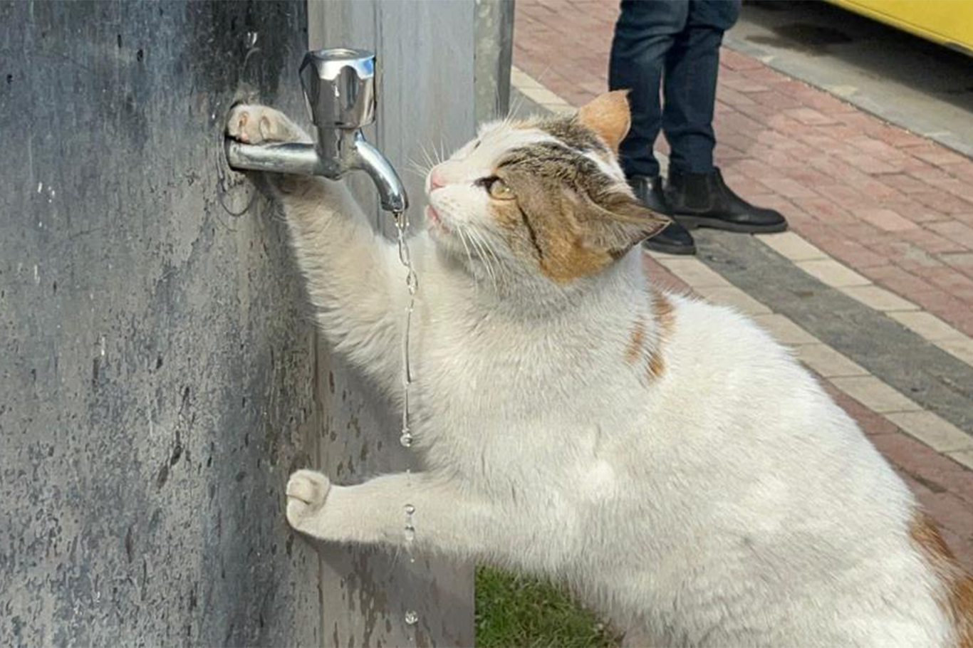 Susuzluktan bitkin düştüğü gözlenen kedinin halini fark eden duyarlı vatandaşlar, musluğu açtı. Bir patisiyle musluğu kavrayan kedi, dakikalarca kana kana su içti.