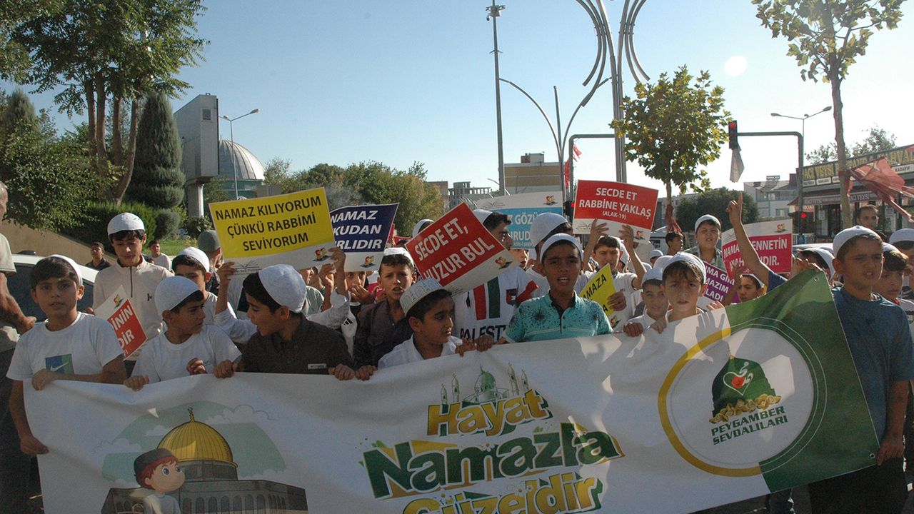 İlçe merkezinde yürüyüş yapan çocuklar ellerinde, "Namaz En Büyük İbadettir", "Namaz Dinin Direğidir", "Haydi Namaza Haydi Kurtuluşa", "Secde Et Huzur Bul", "Namaz Cennetin Anahtarıdır" pankartlarını taşıyarak, "Namaz Cennetin Anahtarıdır" ve Namaz Dinin Direğidir" sloganları attılar.
