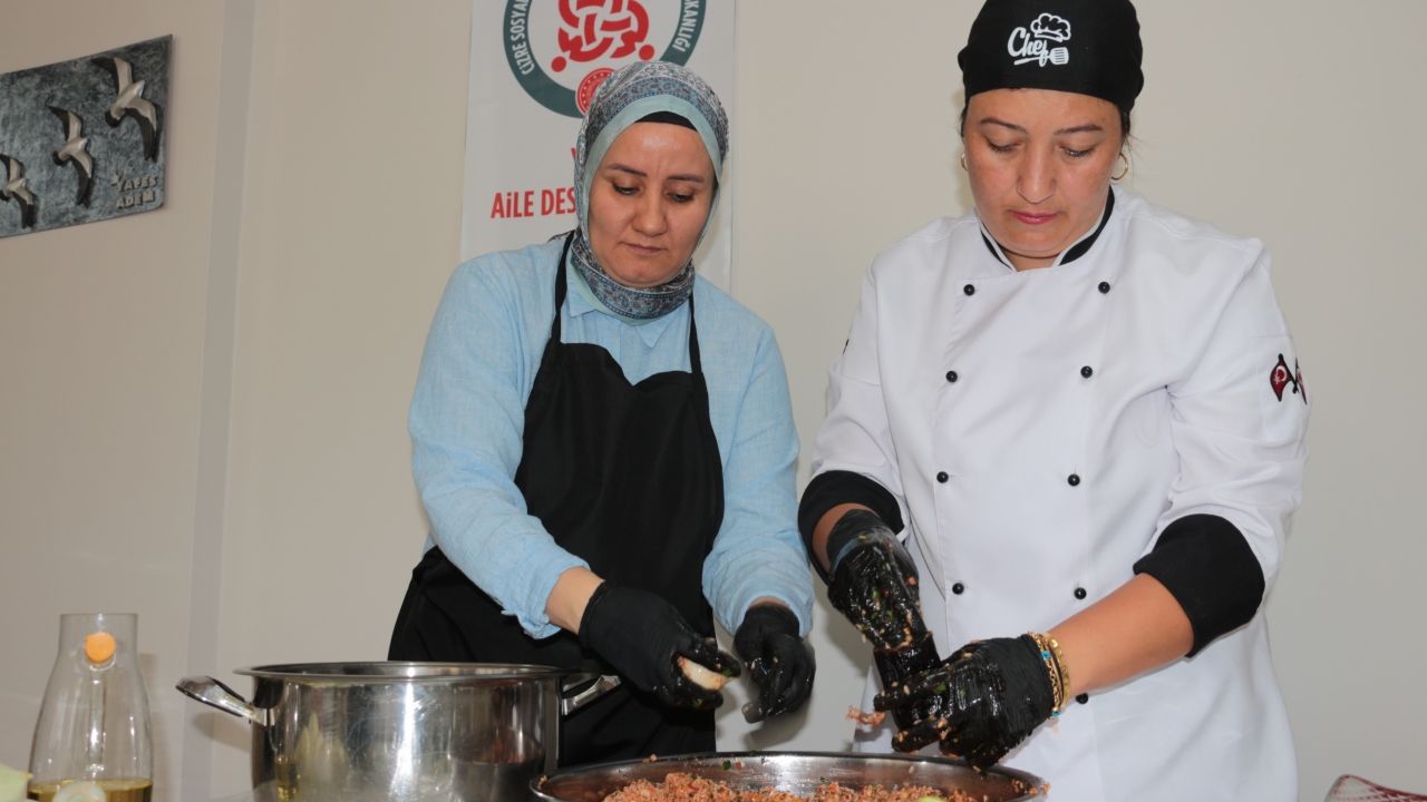 Cizre Yafes Aile Destek Merkezince ilçede açılan "aşçı yardımcısı" kursuna katılan kursiyerlere, önce yöreye has tescilli yemeklerin tanıtımı yapılıyor.