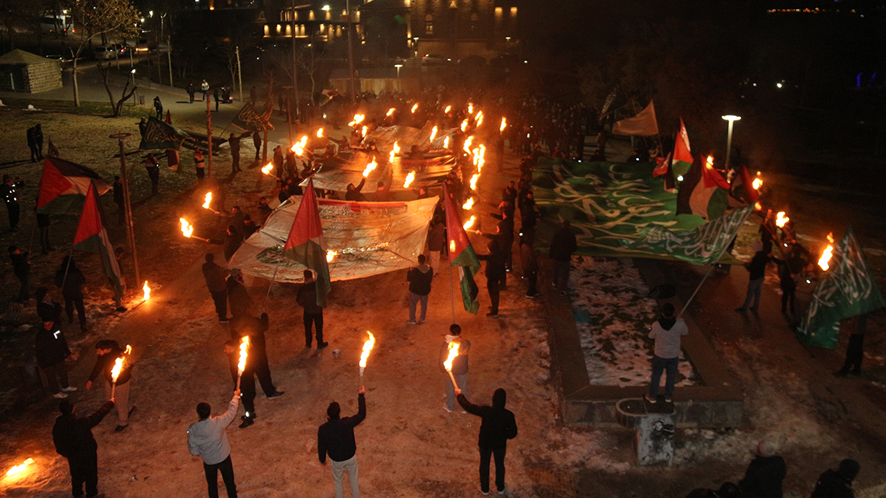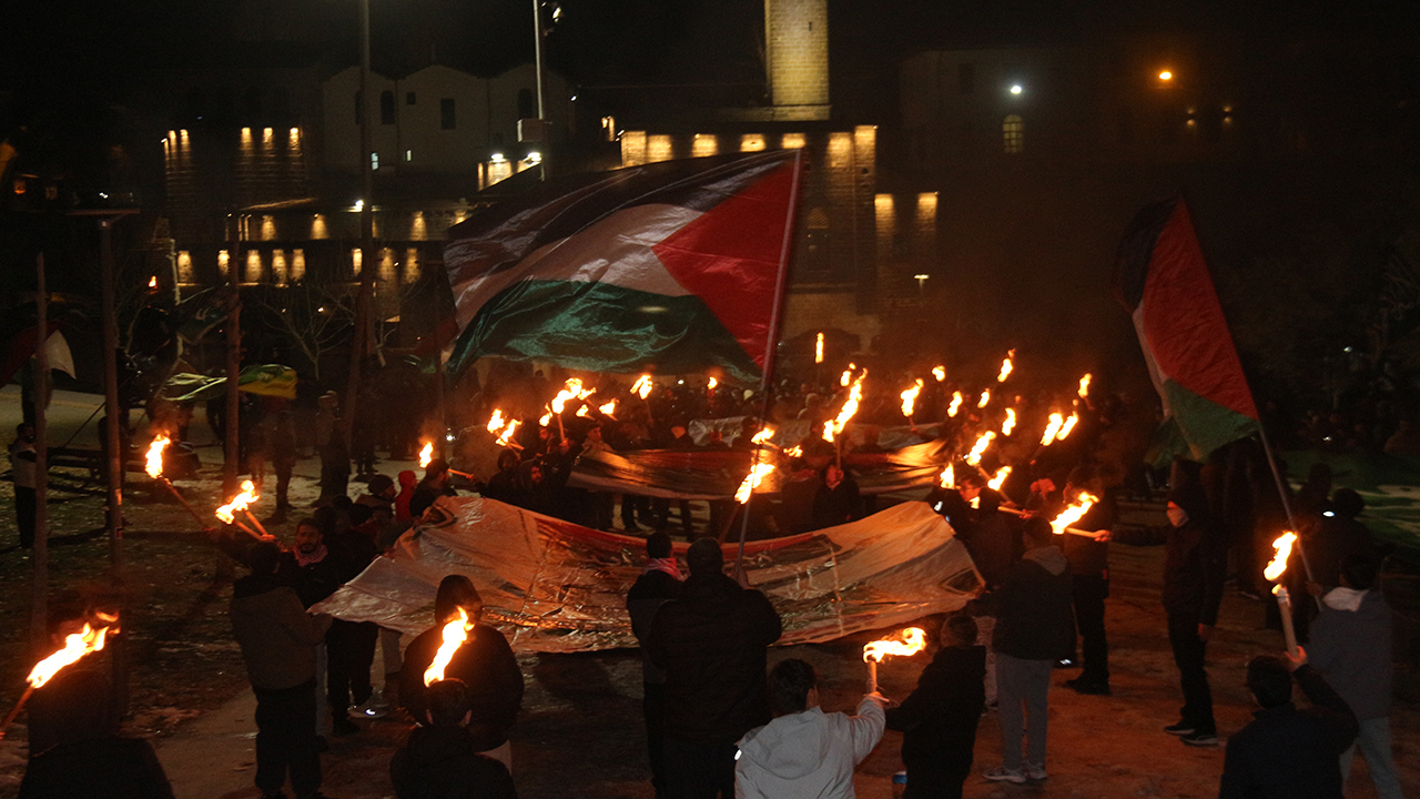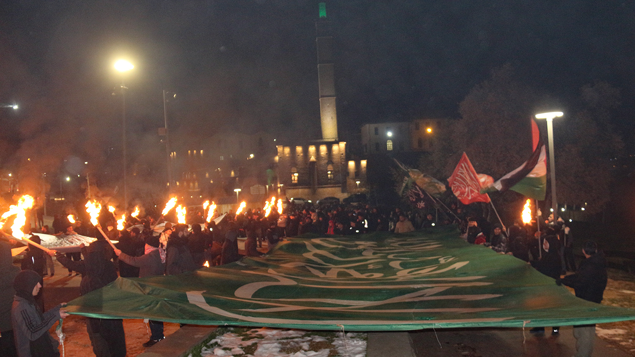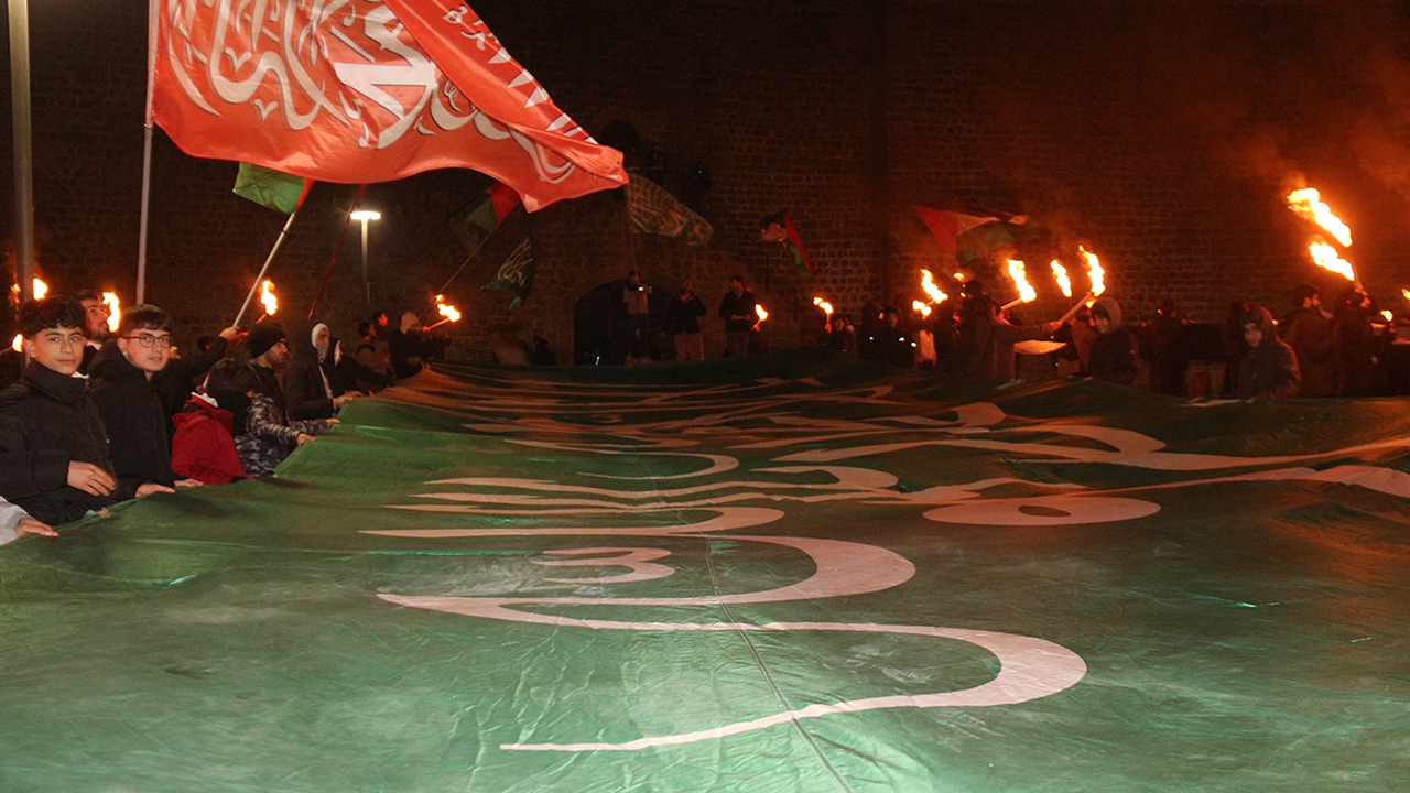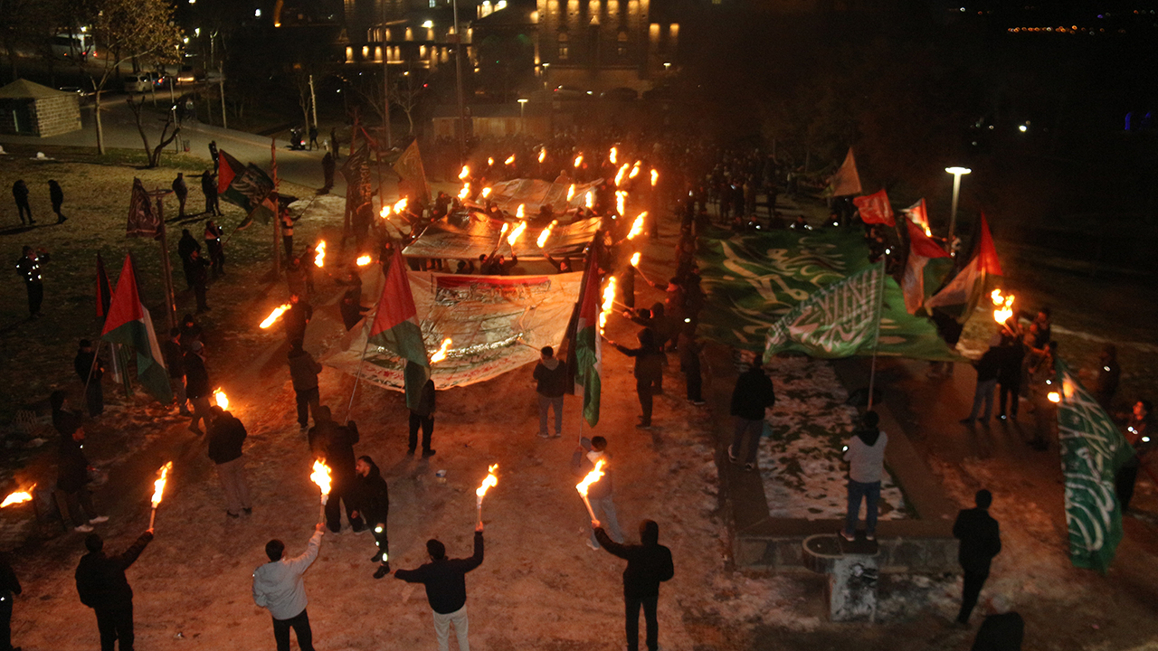 "Gençlik Gazze ile Birlikte" sloganıyla gerçekleştirilen programda, Kudüs davasının yalnızca bir coğrafya meselesi değil, aynı zamanda inanç, kimlik ve ümmet bilinci meselesi olduğu vurgulandı. Miraç Gecesi'nin hicri yıl dönümüne denk gelen etkinlikte, Filistin ve tevhid bayrakları açılırken, Gazze ve Kudüs'e yönelik dayanışma çağrıları yapıldı. Manevi atmosferin hâkim olduğu programda meşaleler yakıldı, tekbirler getirildi ve Kudüs ile Mescid-i Aksa lehine sloganlar atıldı.