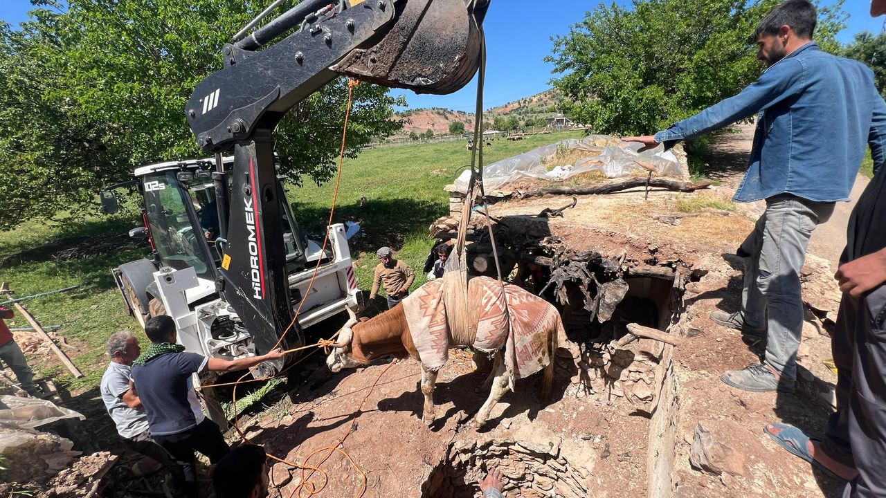 Diyarbakır'ın Hazro ilçesi, kırsal Sarıerik Mahallesi'nde yaklaşık 7 metre derinlikteki su kuyusuna düşen inek, Hazro Belediyesi ekiplerinin çalışmasıyla kurtarıldı.