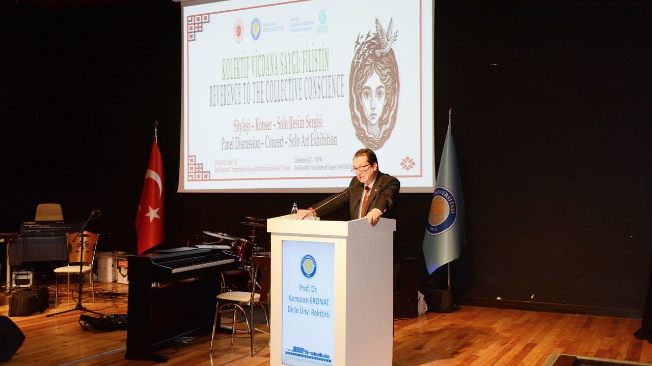 Dicle Üniversitesi Rektörü Prof. Dr. Kamuran Eronat ise etkinliğin yalnızca bir sergi açılışı olmadığını vurgulayarak, programın insanlığın ortak hafızasına ve kolektif vicdanına güçlü bir çağrı niteliği taşıdığını dile getirdi. Üniversitelerin yalnızca bilgi üreten kurumlar olmadığını belirten Eronat, sanatın yaşananların insani boyutunu görünür kıldığını ifade etti.