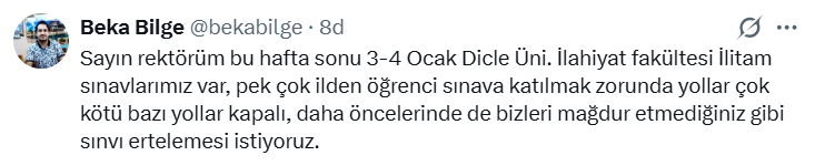 Dicle Üniversitesi’nde kar ve kötü hava koşulları nedeniyle öğrenciler, İLİTAM sınavlarının ertelenmesini veya online yapılmasını talep ediyor. Ancak üniversite yönetimi, sınavlarla ilgili herhangi bir değişiklik yapmayacağını açıkladı.