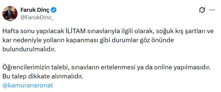 HÜDA PAR Genel Başkan Yardımcısı, Gençlik Politikaları Başkanı ve Mersin Milletvekili Faruk Dinç ise yaptığı paylaşımda, “Hafta sonu yapılacak İLİTAM sınavlarıyla ilgili olarak, soğuk kış şartları ve kar nedeniyle yolların kapanması gibi durumlar göz önünde bulundurulmalıdır. Öğrencilerimizin talebi, sınavların ertelenmesi ya da online yapılmasıdır. Bu talep dikkate alınmalıdır.” ifadelerini kullandı.
