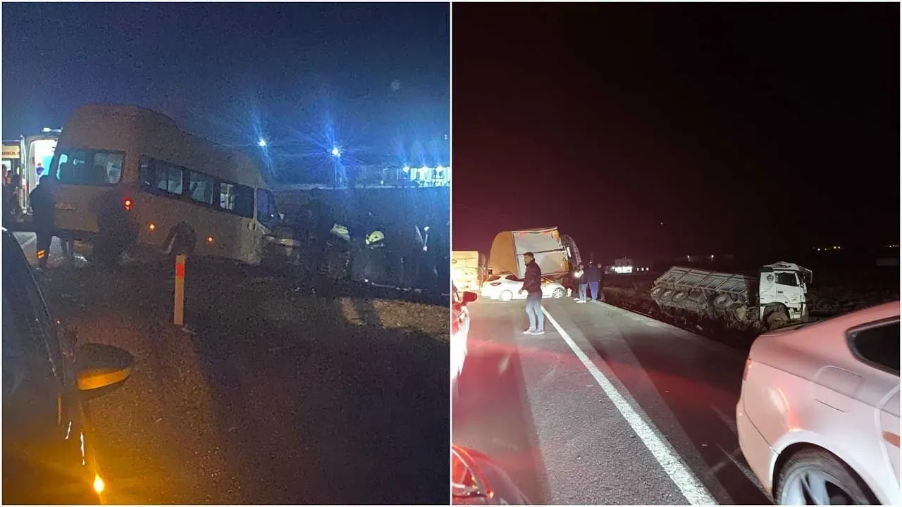 Olay yerinden gelen ilk görüntülerde 2 tırın devrildiği, otomobillerden birinin tırın, diğerinin ise kamyonetin altında kaldığı görüldü.