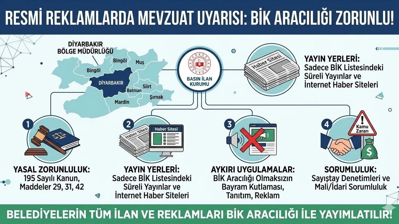 Diyarbakır merkezli olarak Mardin, Siirt, Şırnak, Muş, Bingöl ve Batman’daki belediyelere iletilen yazı, Bölge Müdürü Murat Yürekli imzasını taşıyor. Yazıda, ilan ve reklam süreçlerinde mevzuata tam uyumun zorunlu olduğu özellikle vurgulandı.