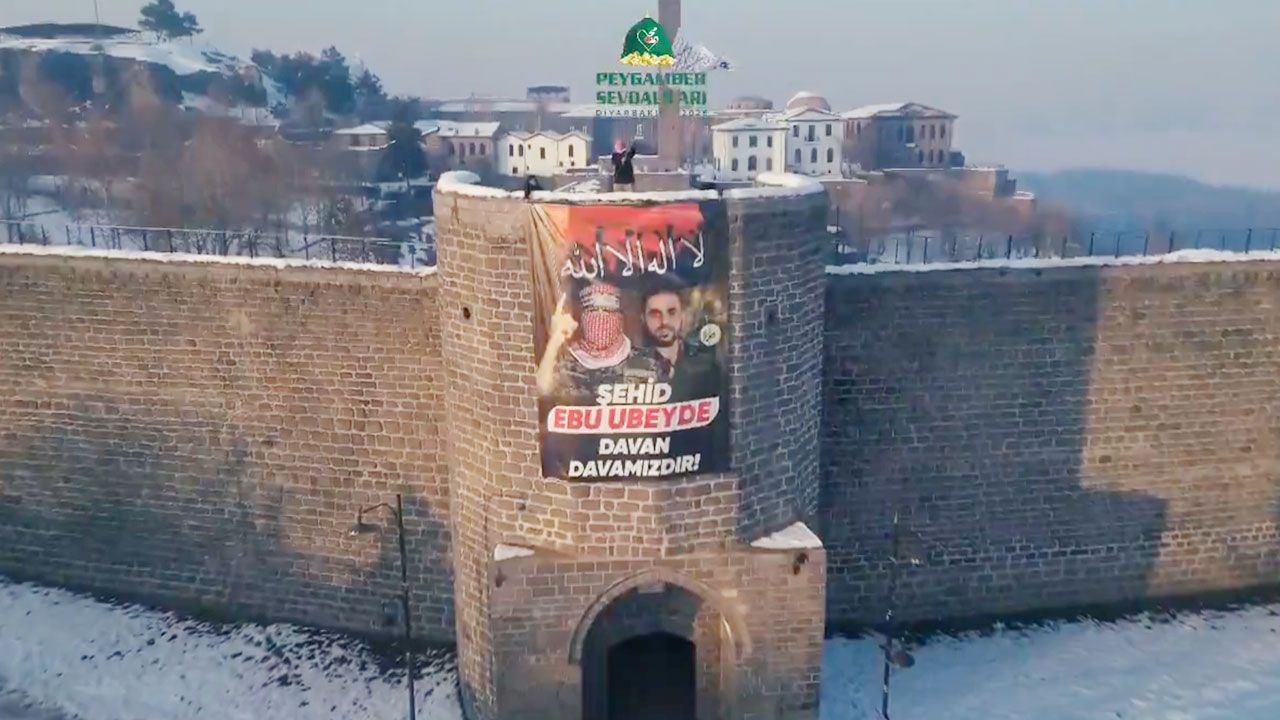 Diyarbakır Peygamber Sevdalıları, Şehit komutan Ebu Ubeyde'nin dev posterini Surlara asarak şu notu paylaştı: