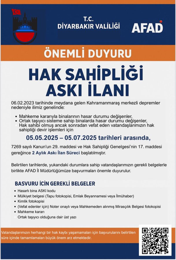 06.02.2023 Kahramanmaraş merkezli depremler sonrası, mahkeme kararıyla özet özeti yapıları, ortak kayıtlı sistemlerdeki değişiklikler ve vefat eden hak sahiplerinin devriyle ilgili finansal yönetimimiz için “Hak Sahipliği Askı İlanı” süreci başlatılmıştır.