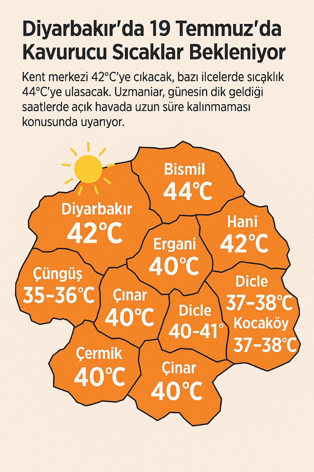 Meteoroloji Genel Müdürlüğü verilerine göre, 19 Temmuz 2025 Cumartesi günü Diyarbakır merkez ve ilçelerinde yaz mevsiminin en sıcak günlerinden biri yaşanacak.