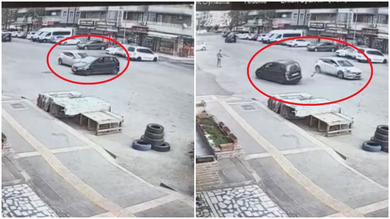 Farklı yönlerden gelen iki otomobil kafa kafaya çarpıştı. Çarpışma anı çevredeki bir güvenlik kamerası tarafından saniye saniye kaydedildi.