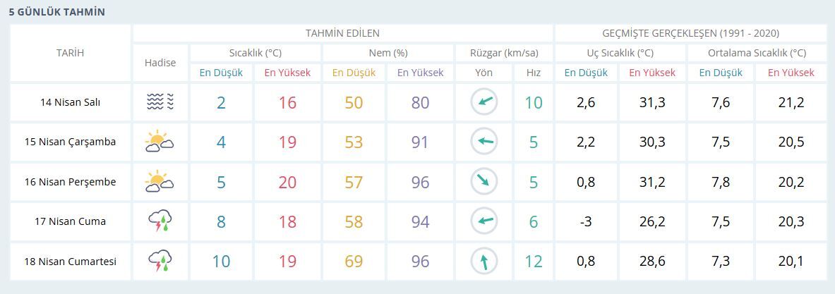 Haftanın ilk günü olan 14 Nisan Salı günü, kentte en düşük sıcaklık 2 derece, en yüksek sıcaklık ise 16 derece olarak tahmin ediliyor. Nem oranının yüzde 50 ila 80 arasında değişmesi beklenirken, rüzgarın saatte yaklaşık 10 kilometre hızla esmesi öngörülüyor.