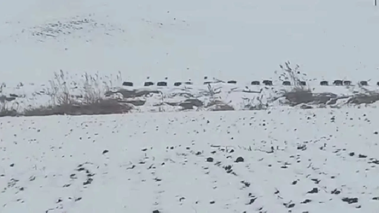 Diyarbakır’ın Bismil ilçesinde karla kaplı arazide sıra halinde ilerleyen yaban domuzu sürüsü cep telefonu kamerasıyla görüntülendi.