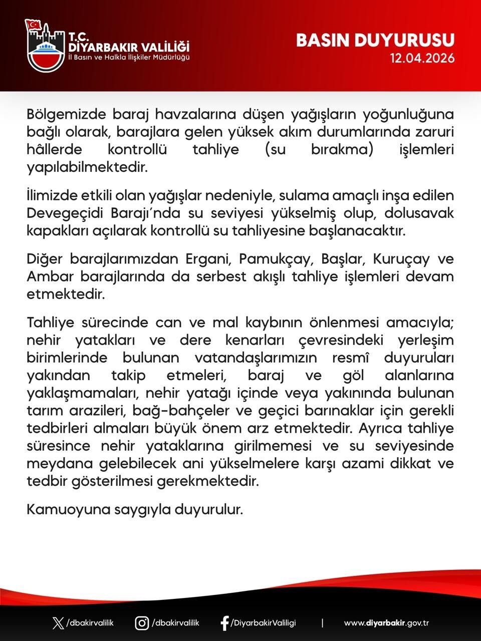 Öte yandan Ergani, Pamukçay, Başlar, Kuruçay ve Ambar barajlarında da serbest akışlı su tahliyesinin sürdüğü ifade edildi.