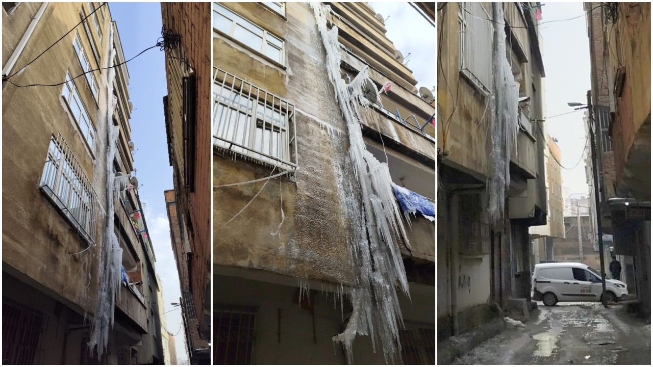 Diyarbakır’ın Bağlar ilçesi Kaynartepe Mahallesi 225. Sokak’ta bulunan 7 katlı bir binada yaşanan su deposu arızası ciddi bir tehlikeyi beraberinde getirdi. Binanın çatısındaki su deposundan sızan su, kırık gider borusundan bina dış cephesine akarak soğuk havanın etkisiyle metrelerce uzunlukta buz sarkıtları oluşturdu.