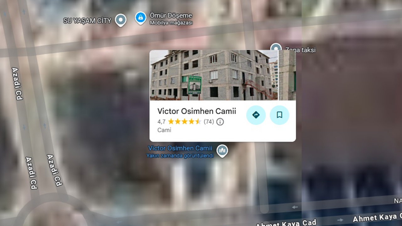 Diyarbakır’ın Bağlar ilçesi Bağcılar Mahallesi Ahmet Kaya Caddesi’nde yapımı devam eden Nur Medine Camii ve Kur’an Kursu, Google Haritalar’da büyük bir skandalla Galatasaray’ın futbolcusu Victor Osimhen’in adıyla yer alıyor.