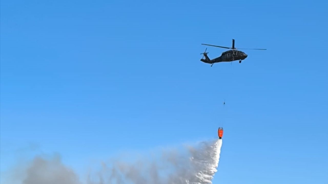 Rüzgarın etkisiyle geniş alana yayılan yangının söndürülmesi için yürütülen çalışmalara iki helikopter de destek veriyor.
