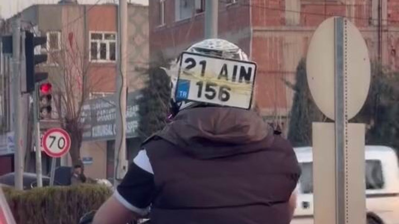 İsmi öğrenilemeyen sürücü, düşen plakasını kaskına bantlayarak trafikte seyretmeye devam etti.