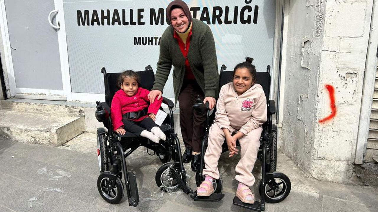 Bağlar ilçesi Muradiye Mahallesi Muhtarı Dilek Demir, hayırsever vatandaşlar tarafından bağışlanan akülü sandalyeleri fiziksel engelli Fatoş Kaya (23) ve Hatice Çelik'e (7) takdim etti.
