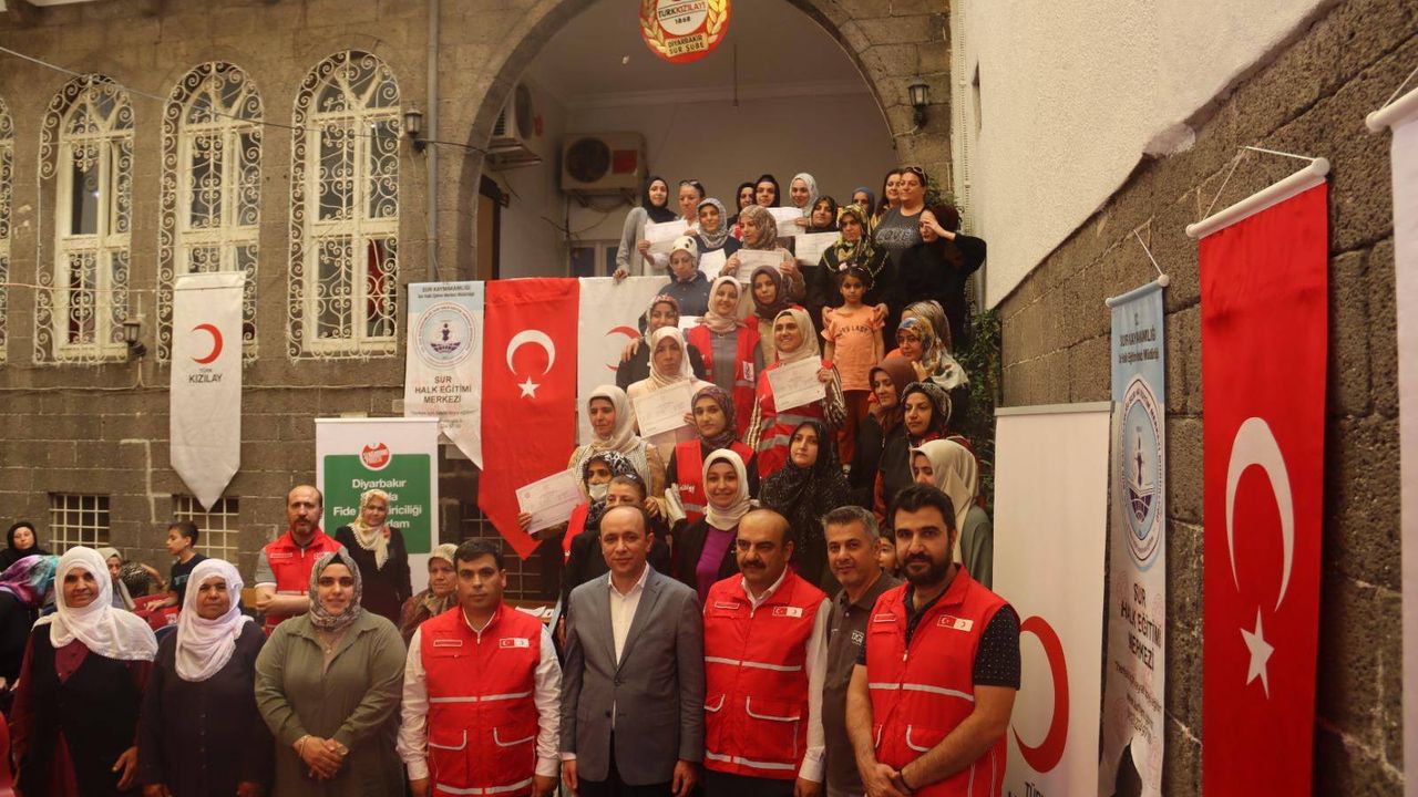 Kursu başarıyla tamamlayan 150 kursiyerden 100’üne, Sur Kaymakamlığı’nda düzenlenen törende sertifikaları teslim edildi. Etkinliğe Sur Kaymakamı Asım Solak, GAPUTAEM Müdürü Kudret Berekatoğlu, Türk Kızılay Diyarbakır Şube Başkanı Ahmet Demirel, Sur Halk Eğitimi Merkezi Müdürü Hasan İkrim ve kursiyerler katıldı.