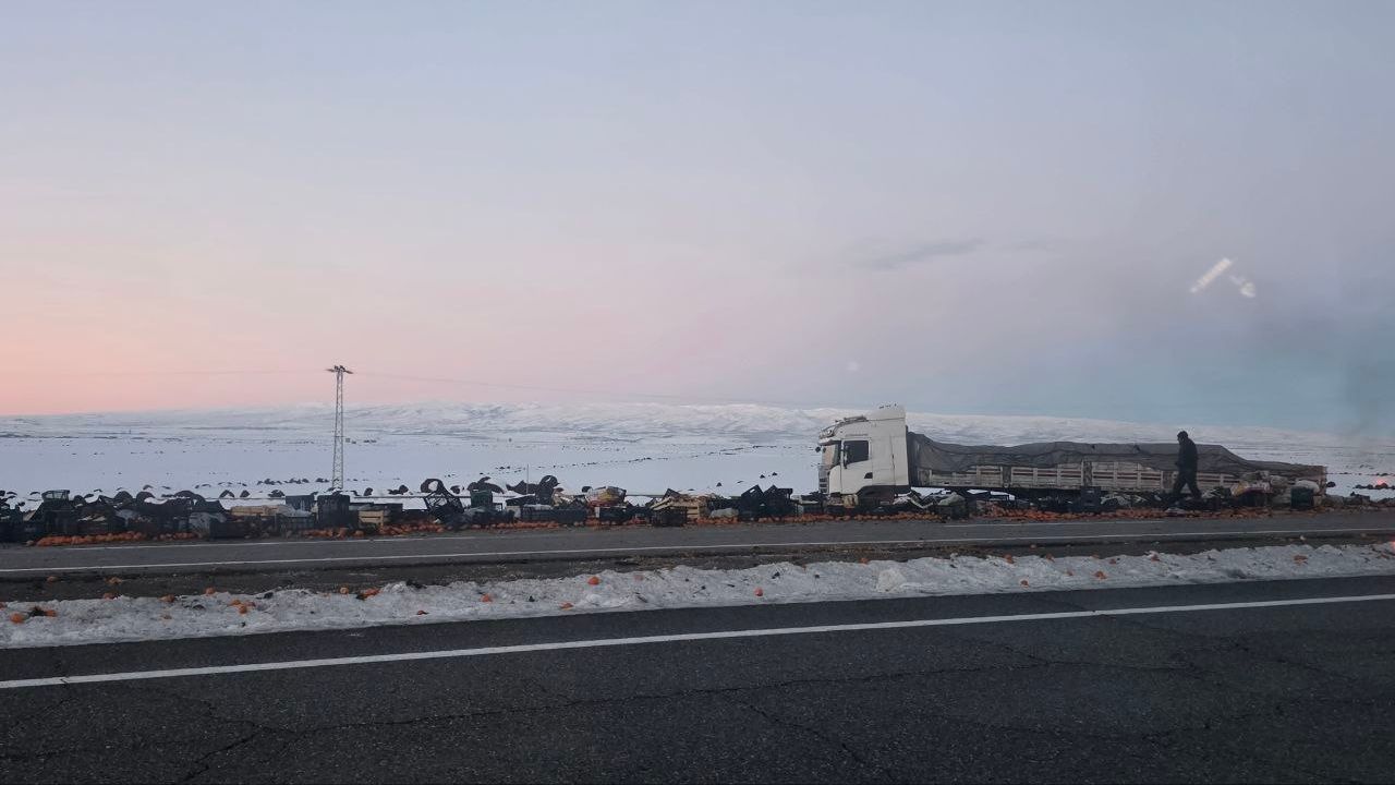 Diyarbakır’da Batman–Mardin çevre yolu Halid Bin Velid Bulvarı’nda virajı alamayan meyve yüklü bir kamyon yan yattı.