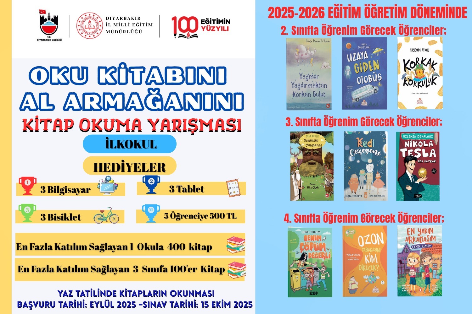 Diyarbakır İl Milli Eğitim Müdürlüğü, kitap okuma alışkanlığının küçük yaşlarda kazanılmasının önemine dikkat çekerek tüm ilkokul öğrencilerini yarışmaya katılmaya davet ediyor.