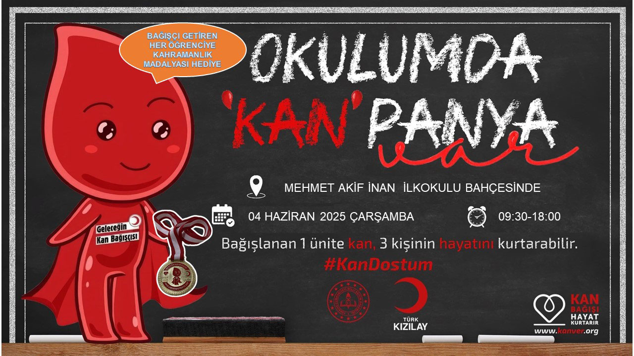"Mehmet Akif İnan İlkokulu'nda bizleri misafir ederek bir gün süren 'Okulumda Kanpanya var' sloganıyla yapılan kan bağış faaliyeti neticesinde toplamda 70 ünite kan bağışı toplanmıştır. Kampanyaya ilham olan kıymetli müdürümüzü, öğretmenlerimizi ve kanpanya kahramanı öğrenci ve velilerimizi kutluyor değerli destek ve çabaları için çok teşekkür ediyoruz."