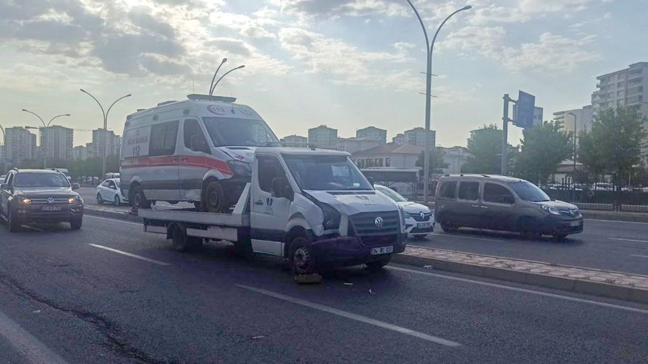 E9 kodlu belediye otobüsüne, başka bir noktada kaza yapan ambulansı taşıyan çekici araç çarptı.