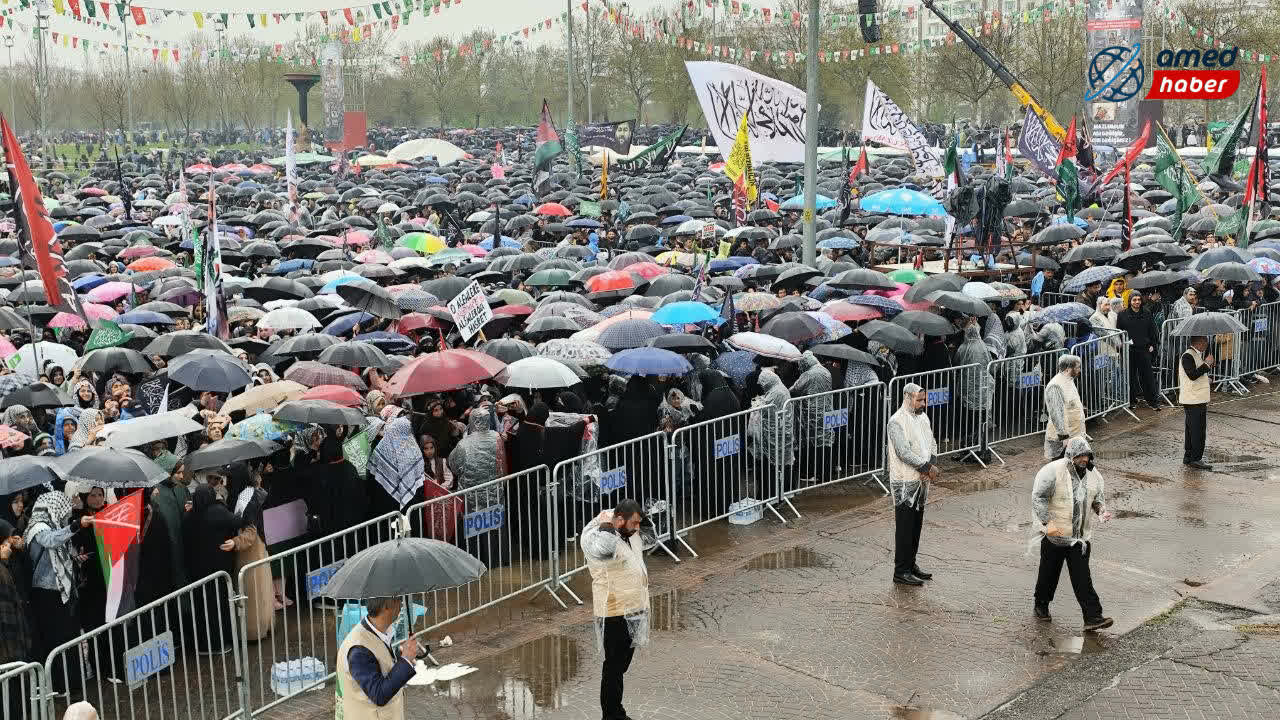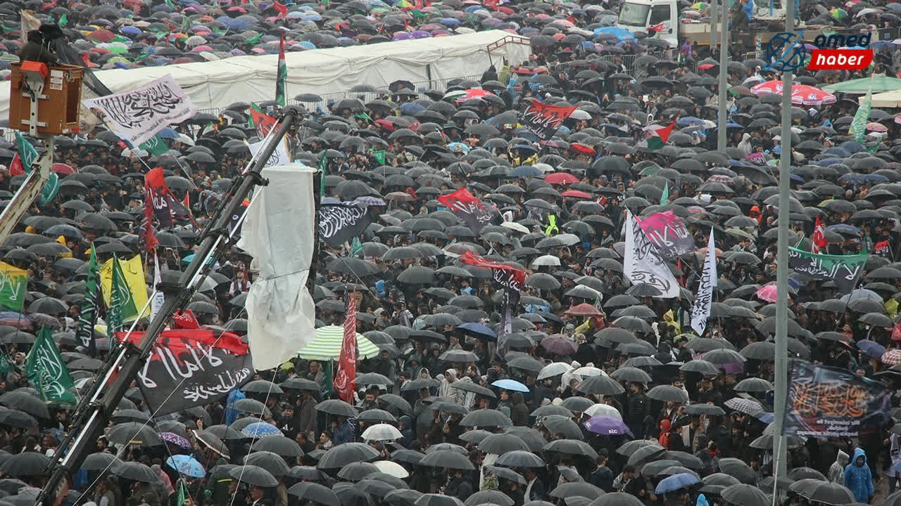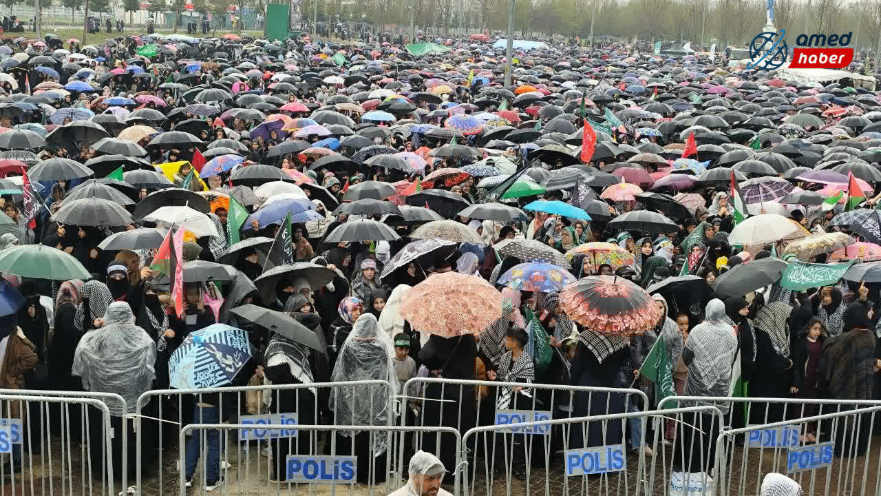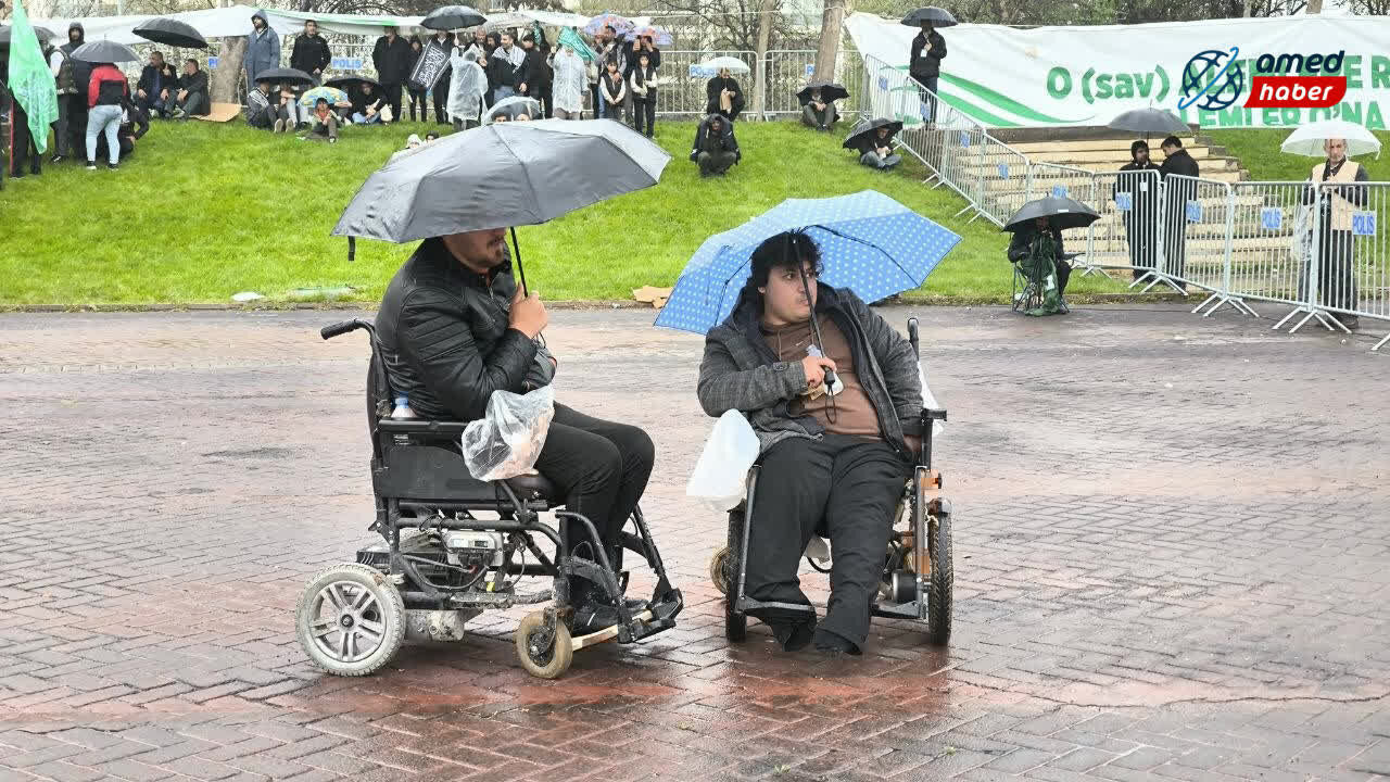 Yağışlı havaya rağmen katılımcılar program alanını terk etmedi; şemsiyeler ve yağmurluklarla Mevlid-i Nebi coşkusuna ortak oldu. Mevlid-i Nebi etkinliğine akın eden kalabalık, kadrajlara böyle yansıdı: