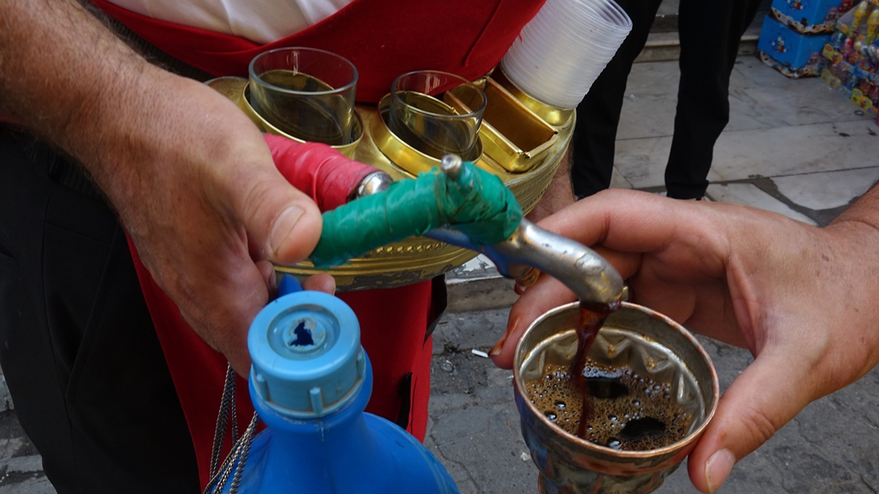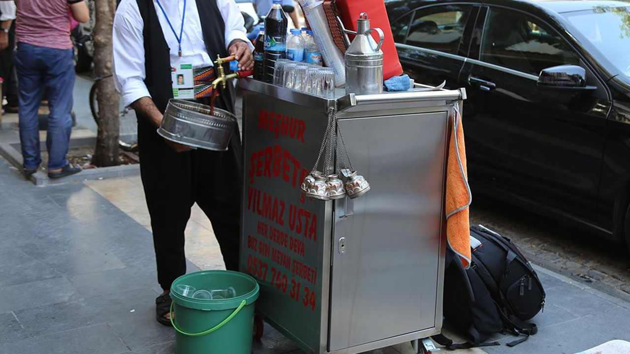 Diyarbakır'ın geleneksel sokak satıcıları arasında yer alan meyan şerbetçileri, omuzlarında taşıdıkları bakır güğümlerle şehrin farklı noktalarında satış yapmaya devam ediyor.
